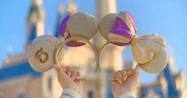 Shanghai Disney Resort has released pictures of THREE new headbands coming in celebration of their 5th anniversary! The first set of ears, a gold fabric ear with gold and purple bow, matches Minnie’s official celebration outfit perfectly.