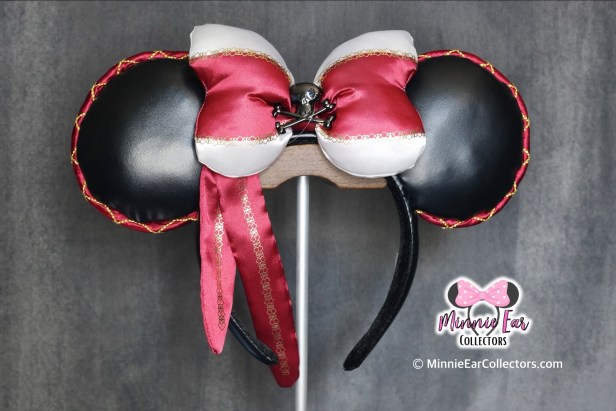 The Pirates of the Caribbean Ears were released at Shanghai Disneyland on May 14, 2021. The ears are made of a leather like material and have gold embellished roping trimming the edges of the ears. In addition, there is a large red and white satin bow that trails to the side with a metal skull and crossbones.