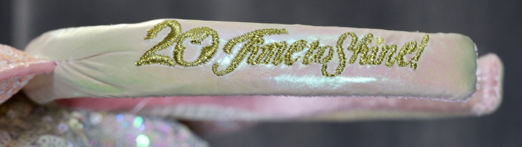 The Tokyo DisneySea 20th Anniversary Pink Ears were released September 3, 2021 at Tokyo DisneySea. The ears feature a light pink/peach glitter ear with an iridescent sequin bow. They are embroidered with the 20th anniversary “Time to Shine!” logo on the side of the headband. These were the first glitter style ears released at the Tokyo Disney Resort.