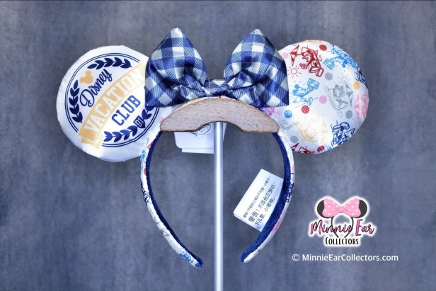 The Disney Vacation Club Ears with Gingham Bow were released in DVC resorts at Walt Disney World on or around October 1, 2021. The ears feature a satin DVC all over Mickey print on one ear and the headband with a black and yellow DVC logo on the other ear.