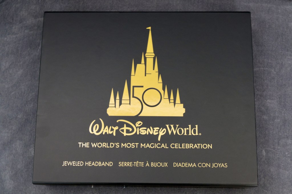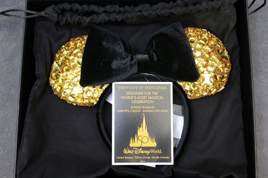 The ears featured a gold sequin with gold gems and a black velvet bow. The Ears came with a dust bag, certificate of authenticity, and a 50th celebration box. The ears were released in extremely limited quantity on release day (only four pairs at Ever After), but were released again throughout the week and on shopDisney. No official numbers on production were released.