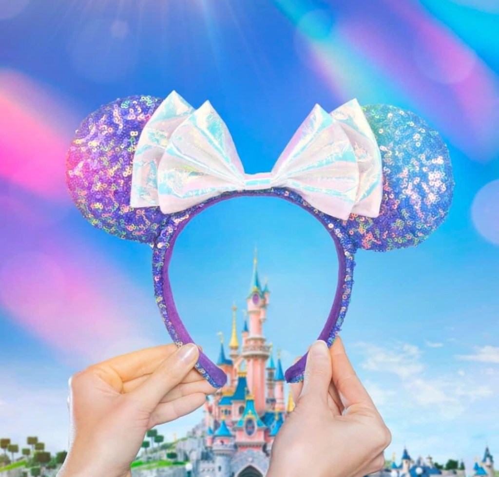 With the Disneyland Paris 30th Anniversary quickly approaching, Disneyland Paris has shared a preview of two new upcoming pairs of ears! The first pair, previewed for the first time today, features a purplish/blue sequin ear with a white iridescent bow. The second pair of ears features a design that was voted on by the Disneyland Paris Instagram followers. The vote consisted of the color of the ears, the color of the bow, the pattern of the bow, and the pattern on the ears.