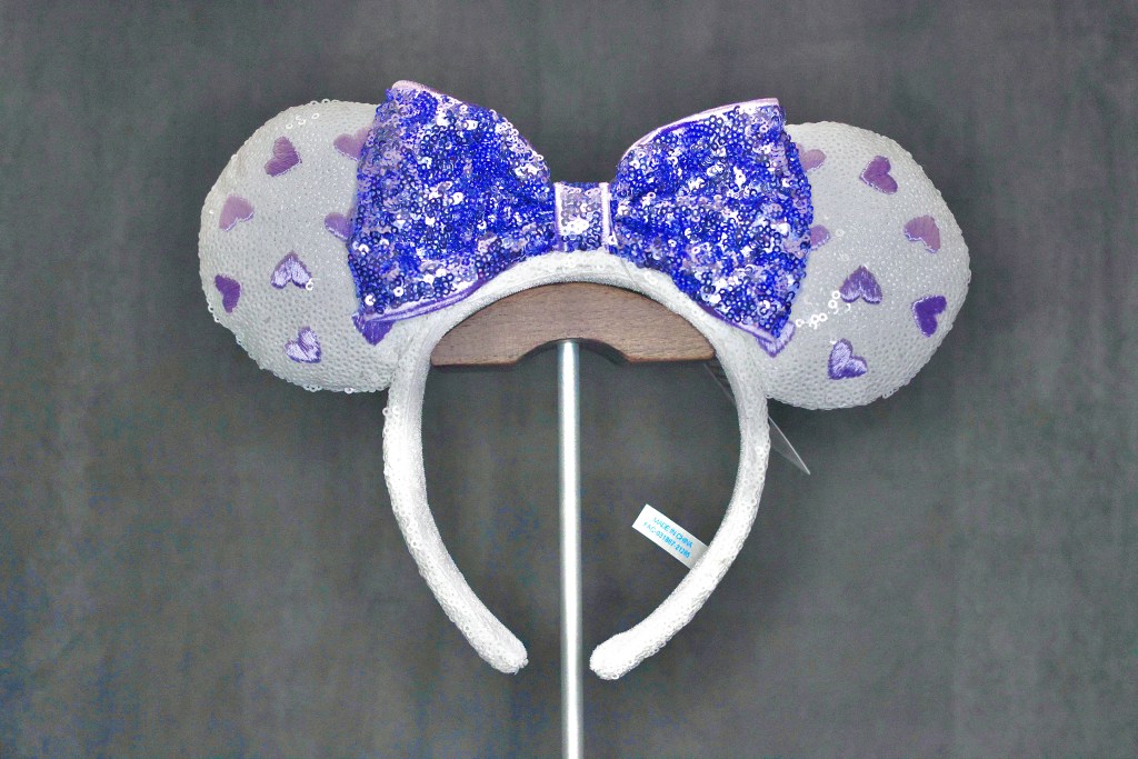The White Ears with Purple Hearts were released at the Tokyo Disney Resort on January 12, 2022. The ears feature a white sequin with light purple Hearts embroidered on the sequins. The ears are topped off with a light purple sequin bow.