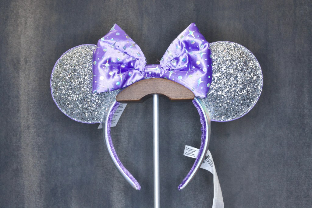 The Purple Glitter and Holographic Bow Ears were first released at Hong Kong Disneyland on March 7, 2022 and at Walt Disney World on March 9, 2022. They arrived on shopDisney in the US on March 14, 2022. The ears are silver glitter with a purple satin bow with a celestial print.