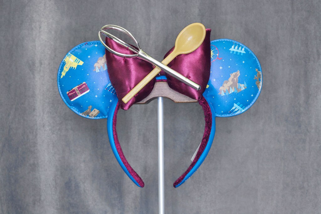 The Disney California Adventure Food and Wine Festival Ears were released on March 3, 2022. The ears are made from a faux leather material with a consistent all over print. The ears are finished with a puffy satin bow and a plastic whisk and plastic “wooden” spoon.