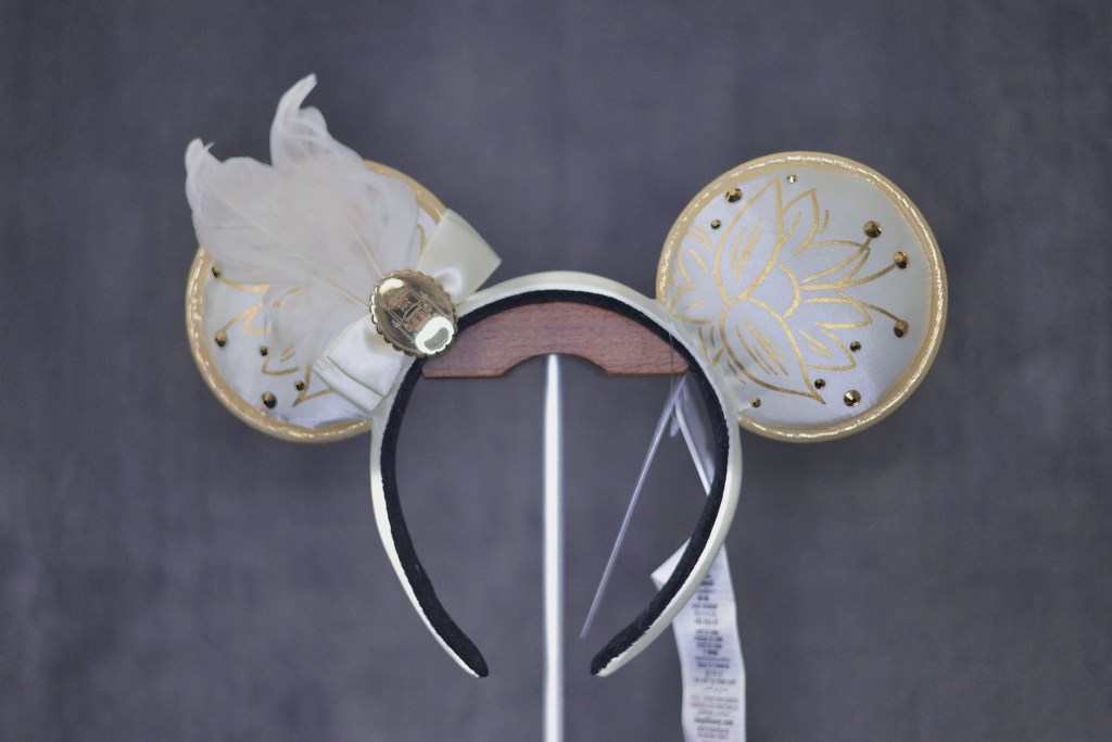 The Tiana Ears were first released in Hong Kong Disneyland on July 3, 2022. They made their way to the US with a first release in Disneyland on August 1, 2022. The ears are a white satin with a gold printed water lily, gems, and accent around the edge of the ears. The ears also adorned with white feathers, a small bow, and a gold emblem of Tiana’s Place.