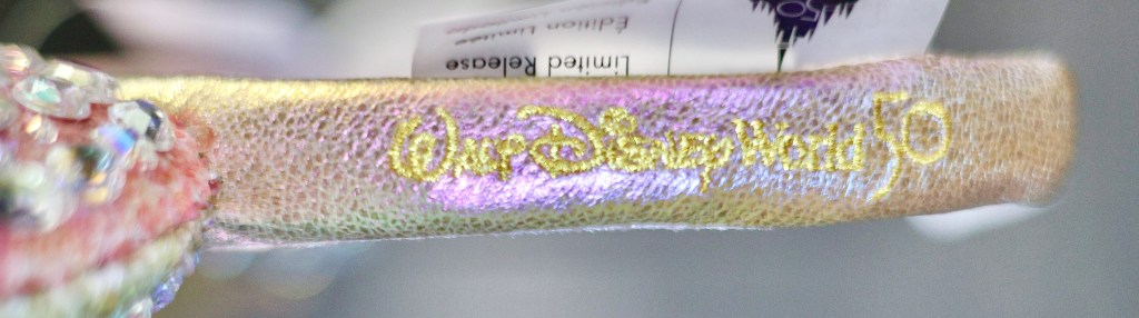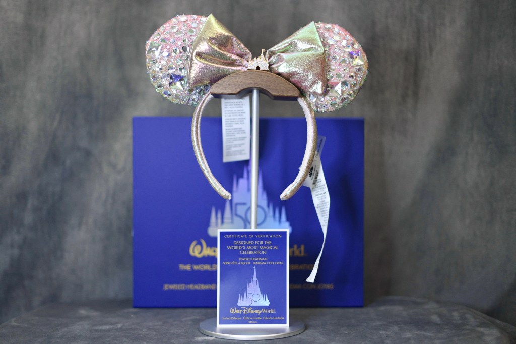 The 50th Celebration Upscale Jeweled Limited Release Ears Headband was first released at Magic Kingdom and select deluxe resorts around the Walt Disney World Resort on June 29, 2022. The ears feature an EARidescent sequin with jewels on top. The ears are finished with an EARidescent bow with gold and gemmed castle and an EARidescent headband with Walt Disney World 50 embroidered on the side. The ears come with a blue box, dust bag, and certificate of authenticity. A matching ear hat was also released.