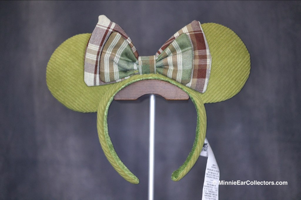 The Pear Corduroy Ears with Plaid Bow were first released on shopDisney on August 1, 2022. The ears feature a pear-green corduroy fabric with a corduroy green and brown bow.