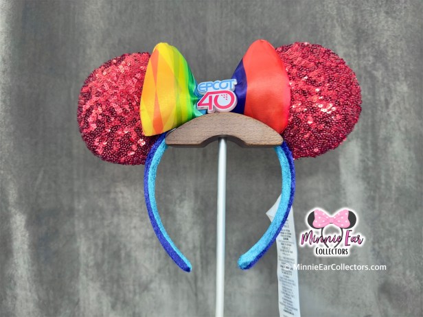 The EPCOT 40th Anniversary Sequined Ears were first released on shopDisney on October 1, 2022 as part of the EPCOT 40th Anniversary Collection. The ears feature a red sequin ear with a blue satin headband. The ears are accented with a multi color sequin bow and a metal EPCOT 40 logo.
