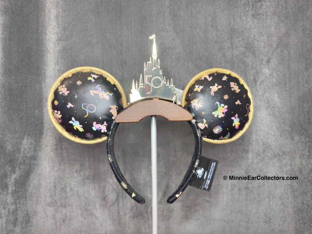 The Walt Disney World 50th Anniversary Finale Ears were released on shopDisney on January 2, 2023. The ears feature a black faux leather with gold character and 50th screen printed emblems. The the ears are trimmed in gold satin and topped with a metal Cinderella Castle 50th die-cut.