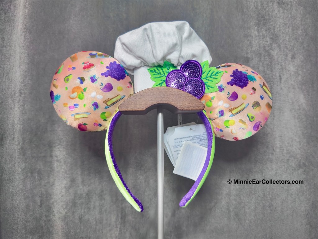 The 2023 Disney California Adventure Food & Wine Festival Ears released March 3, 2023. The ears feature a satin all over print of foods and is completed with a chef hat and sequin grape embellishment.