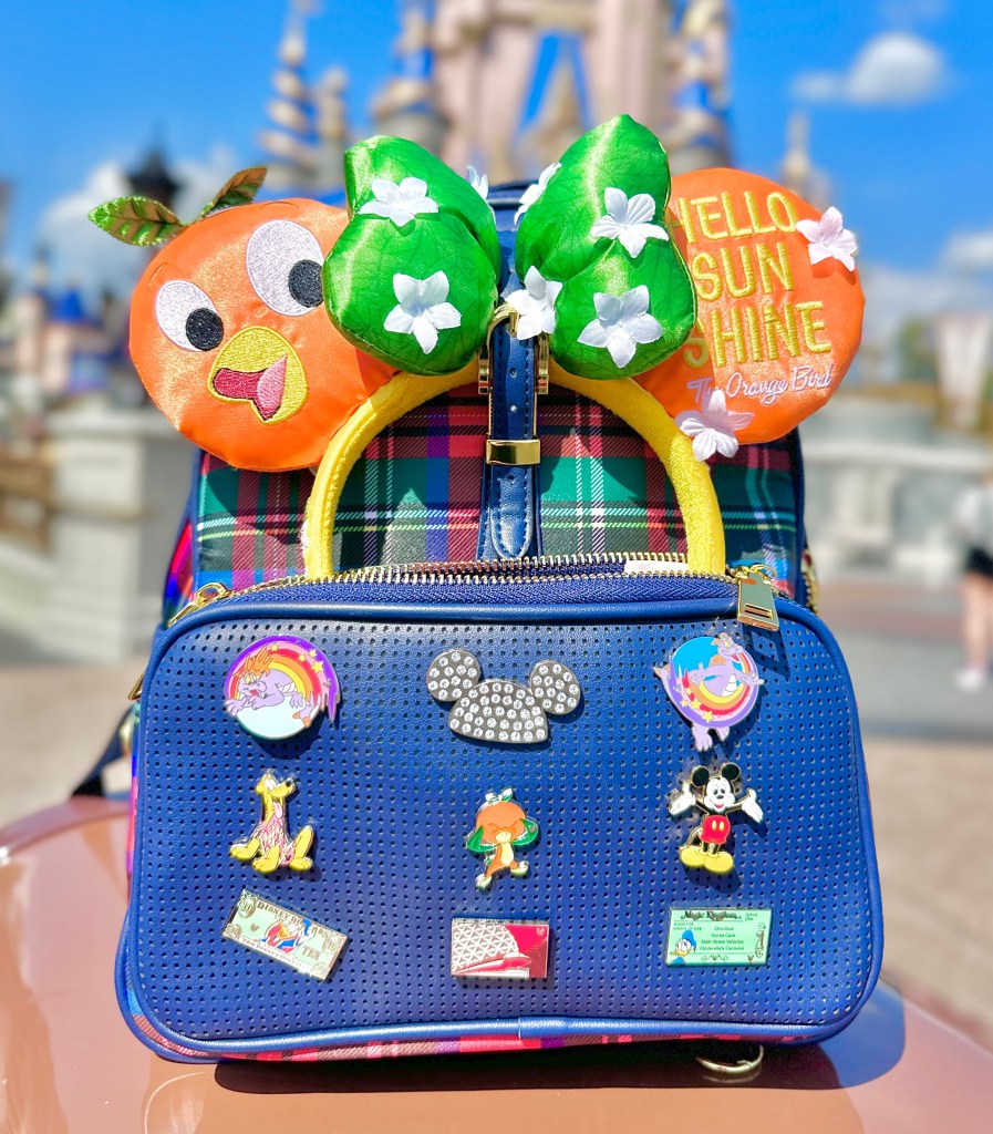 The second thing to notice about the backpack is the pin display pocket. This pocket is multifunctional as you can use it to display your pins, extra storage, or you can opt to leave it slightly open and tuck the headband of your ears in. Since I chose to carry extra ears, I ended up zipping the bag up to the headband leaving it open in the center. This still kept all of my belongings secure – including that extra pair of ears! As for the pins, the bag comes with 10 locking pin backs to keep your pins secure and from falling off. Being able to display my pins on my bag was a new feature for me and it is also lots of fun because you can theme your bag to your look or even your ears! Now I also have pins available to trade when I am in the parks (instead of wishing I had remembered to bring them).