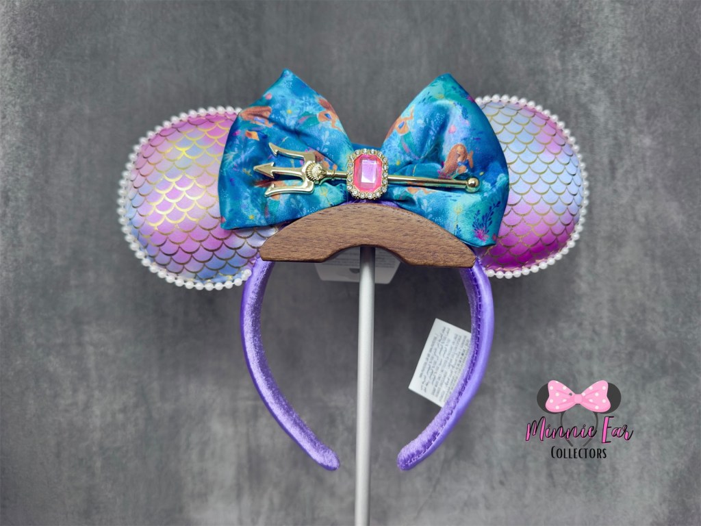 The Little Mermaid Live Action Ears were first released on shopDisney and in Walt Disney World and Disneyland on April 24, 2023. The ears feature a satin allover golden scale pattern with an Ariel print featured on the blue satin bow. A jeweled trident brooch decorates the center of the bow.