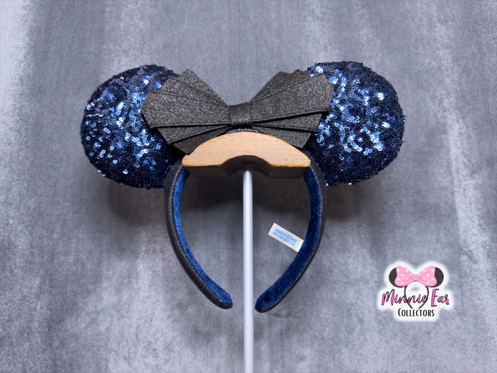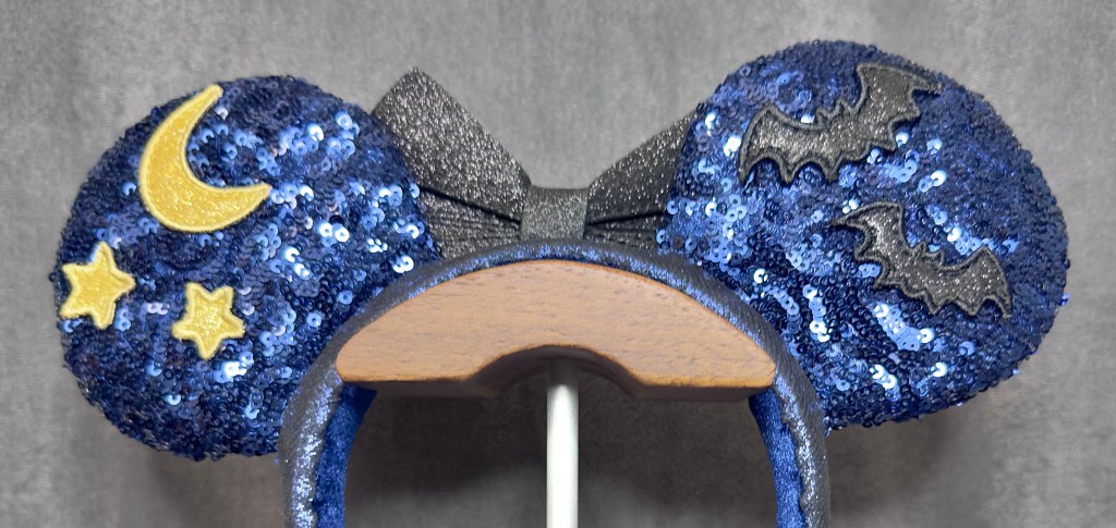 The headband is made of a navy blue sequin with a black flat style bow (same as the first Disney100 Ears). On the back, the left ear features a gold moon and stars stitched on while the right ear has two black bats.