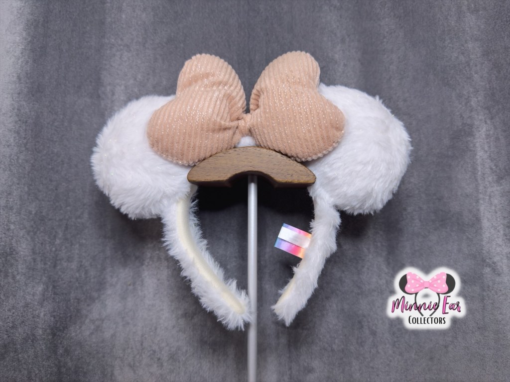 The Fluffy 40th Anniversary Ears will release at Tokyo Disney Resort on September 14, 2023. The ears are made of a white fluffy fabric with a pink castle patch on the back. The ears have a pink corduroy bow in the center.