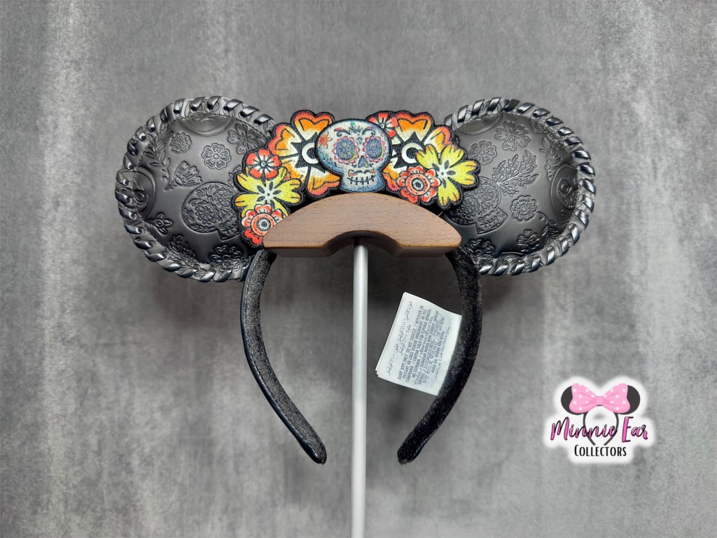 The Black Embossed Coco Ears were first released at Disneyland on August 25, 2023. They released in Walt Disney World the next day. The ears are made of black faux leather with embossed flowers and sugar skulls. Rather than a bow, the ears feature embroidered flowers and a sugar skull in the center.