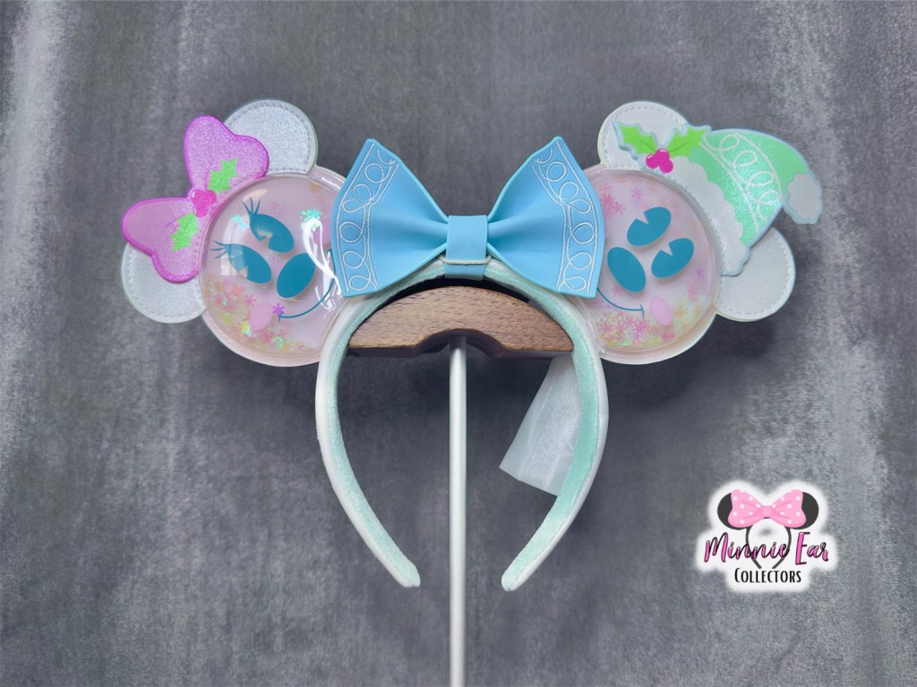 The ears feature three-dimensional details with Mickey and Minnie and glittery details. When you move the headband, you can see loose snowflakes float inside of their domed faces, giving them a snow globe effect! The ears are completed with an embroidered bow that detaches for versatile wear.