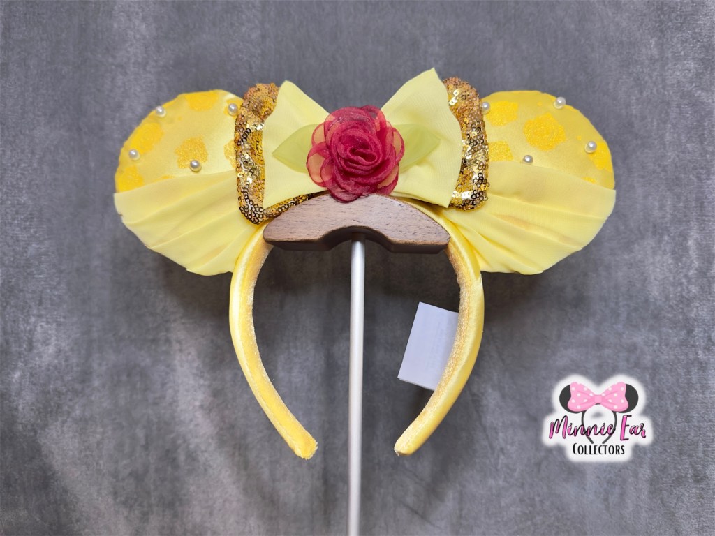 The 2023 version of Belle Ears was first released at The Mad Hatter in Disneyland on September 24, 2023. The ears feature yellow satin with gold embossed roses and yellow draping. The bow is gold sequin and yellow with a red rose in the center.