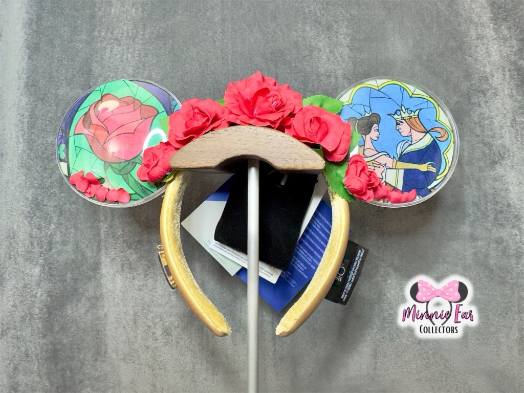 The Disney 100 Decades Collection Ears – 1990s Beauty and the Beast Ears first released in Magic Kingdom on September 15, 2023 ahead of the official collection release on shopDisney and in parks on September 18, 2023. The 1990s Beauty and the Beast Ears feature a stained glass design with the rose on one ear and Belle with the Prince (Prince Adam) along with rose petals. The ears light up and come with a USB charging cord.