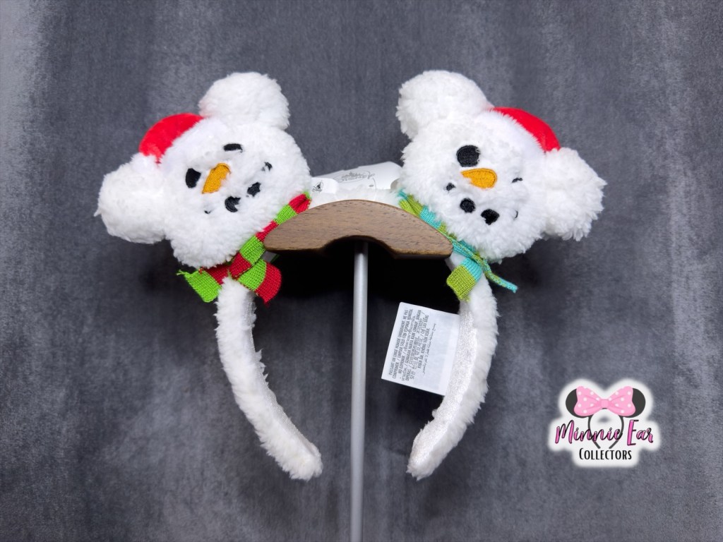 The Mickey Plush Snowman Ears first released on shopDisney on October 2, 2023. Each “ear” consists of a plush Mickey Snowman with different embroidered details. At the neck of each Mickey snowman is scarf.