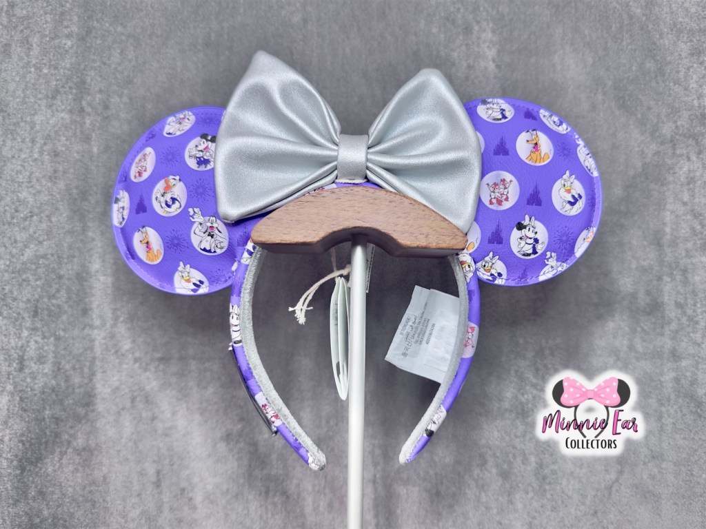 The Mickey and Friends Disney100 Loungefly Ears first released in Disneyland on September 26, 2023. They were available in Walt Disney World on September 29, 2023. The ears are a faux leather and feature the portraits of Mickey, Minnie, Goofy, Pluto, Donald, Daisy, and Chip and Dale in their Disney100 outfits on a purple background. The ears are topped off with a silver faux leather bow and have a glittery silver Loungefly plaque on the side of the headband.