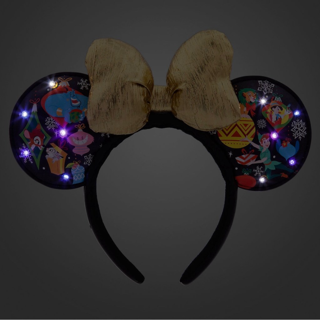 The Disney Light-Up Ornament Ears first released on shopDisney on October 12, 2023. The ears feature chance including Genie, Bambi, Thumper, Cheshire Cat, Peter Pan, Pinocchio, Jiminy Cricket, Simba, Dumbo and Stitch. A gold lurex padded bow is at the center of the ears. The ears feature LED lights that are rechargeable via an included USB cord.