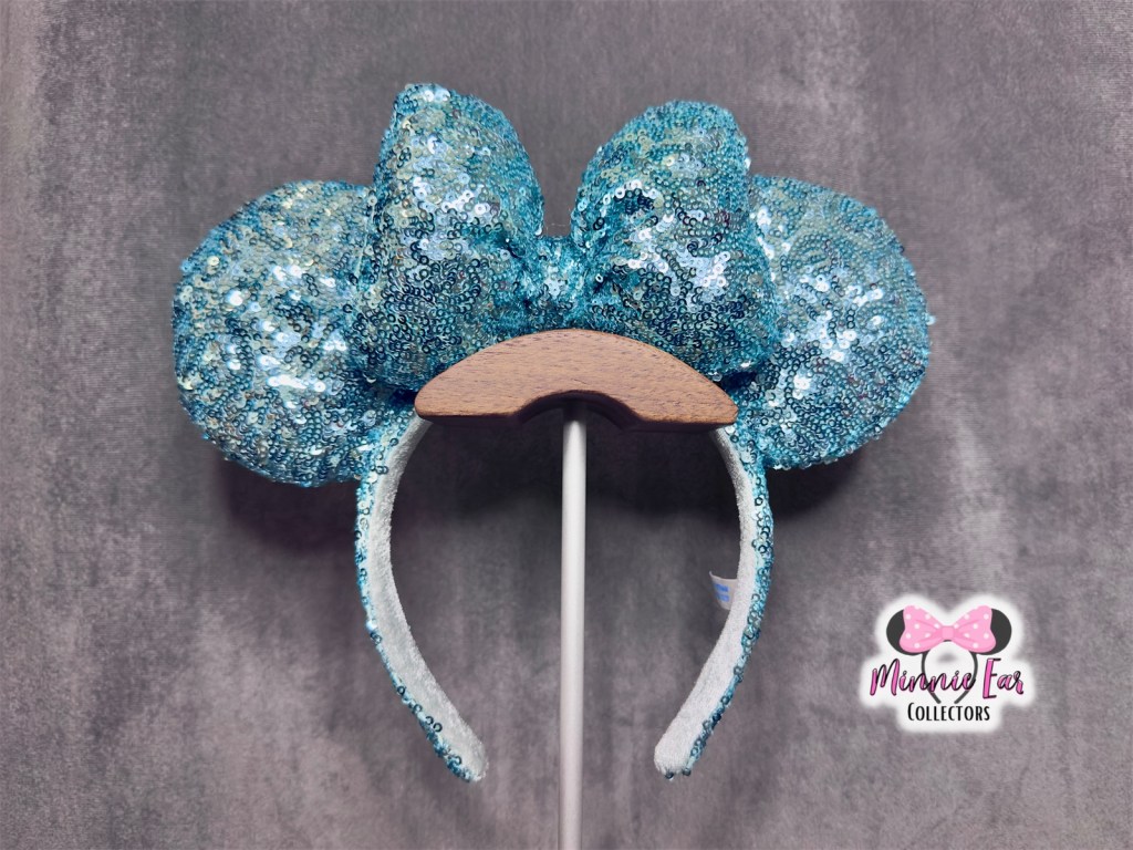 The Aqua Sequin Ears with Puffy Sequin bow released at Tokyo Disney Resort on October 26, 2023. The ears feature a light aqua sequin with a puffy pink sequin bow.