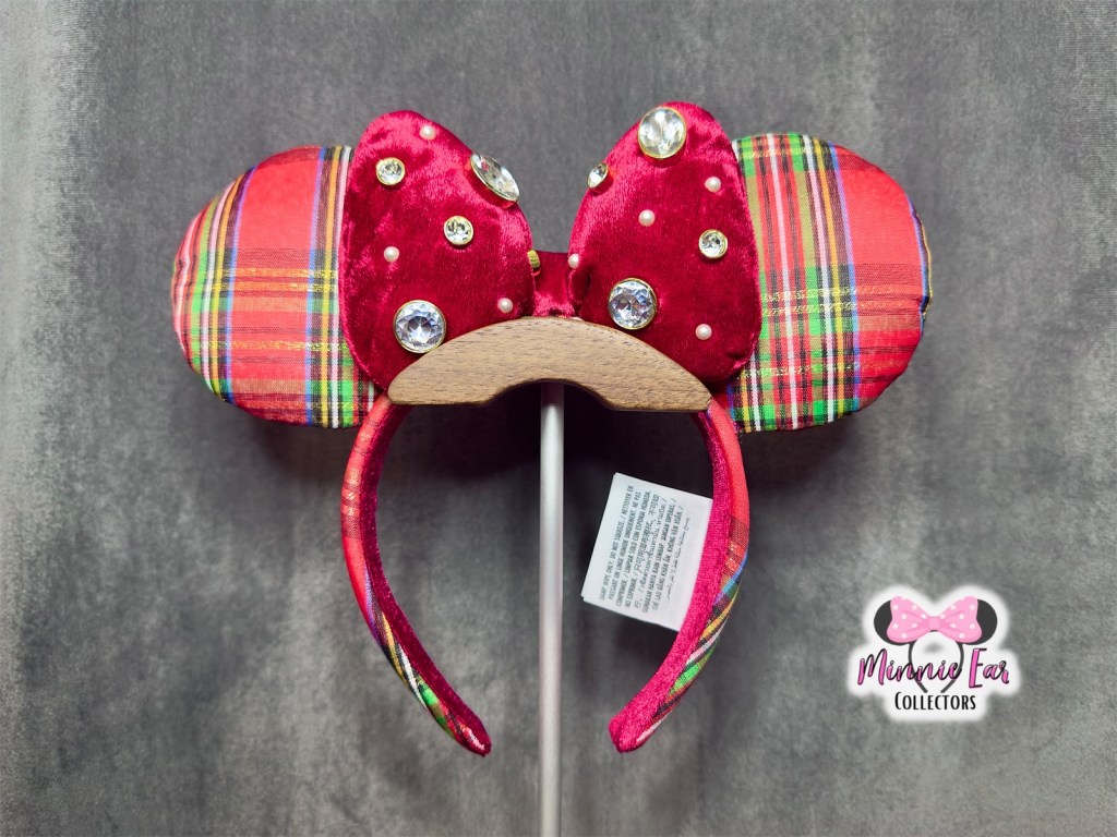 The Christmas Tartan Ears were first released on shopDisney on October 30, 2023 and in parks shortly after. The ears feature a fabric red tartan plaid with a gold shimmer. A velvety bow adorned with rhinestones completes the ears. In addition, a matching Loungefly mini backpack was also released.