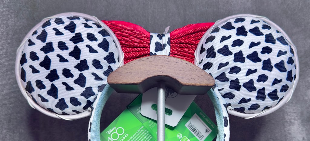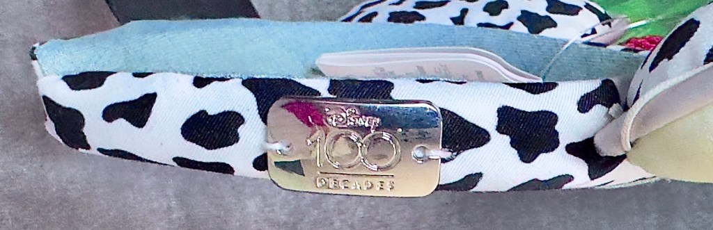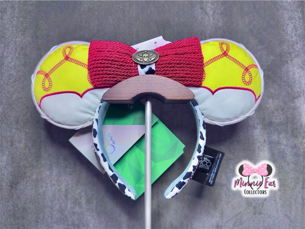 The Disney 100 Decades Collection Ears – 2010s Toy Story 3 Ears first released in Disneyland and on shopDisney on November 20, 2023. The ears are padded satin themed to Jessie from Toy Story. The ears have an embroidered “yoke” filigree “Cowhide” print fabric with a Rope yarn bow. There is an antiqued metal buckle at the center of the bow. The side of the headband is embroidered “Jessie” on one side and the metal Disney100 Decades Collection plaque on the other.