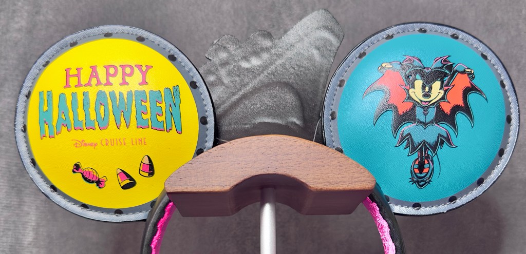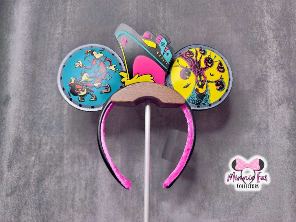 The Disney Cruise Line Halloween 2023 Ears were released for Halloween of the High Seas Cruises starting at the end of September 2023. The ears match the style of the 2023 DVC and Aulani Ears. They feature a faux leather with Goofy and Donald on one ear and the Halloween tree on the other. The back has Happy Halloween Disney Cruise Line and Vampire Minnie. The edge of the ears has an embossed riveting with a cruise ship in the center to complete the nautical theme.
