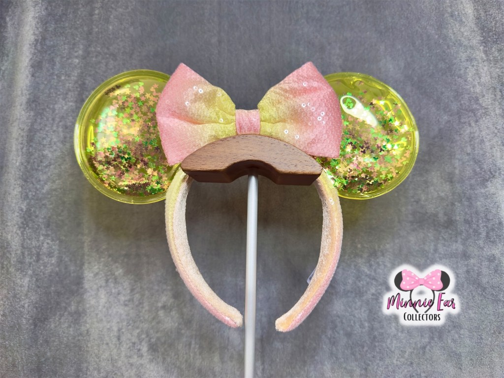 The Yellow Confetti Ears were released at Shanghai Disney Resort on June 4, 2023. The ears are yellow tinted plastic filled with yellow and pink star confetti. There is a yellow and pink ombré sequin bow at the center.