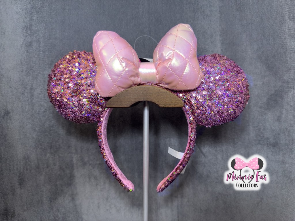 The Minnie’s Funderland Pink Sequin Ears released at Tokyo Disneyland on January 9, 2024. The ears feature a shimmering holographic pink sequin with an iridescent pink faux leather bow.