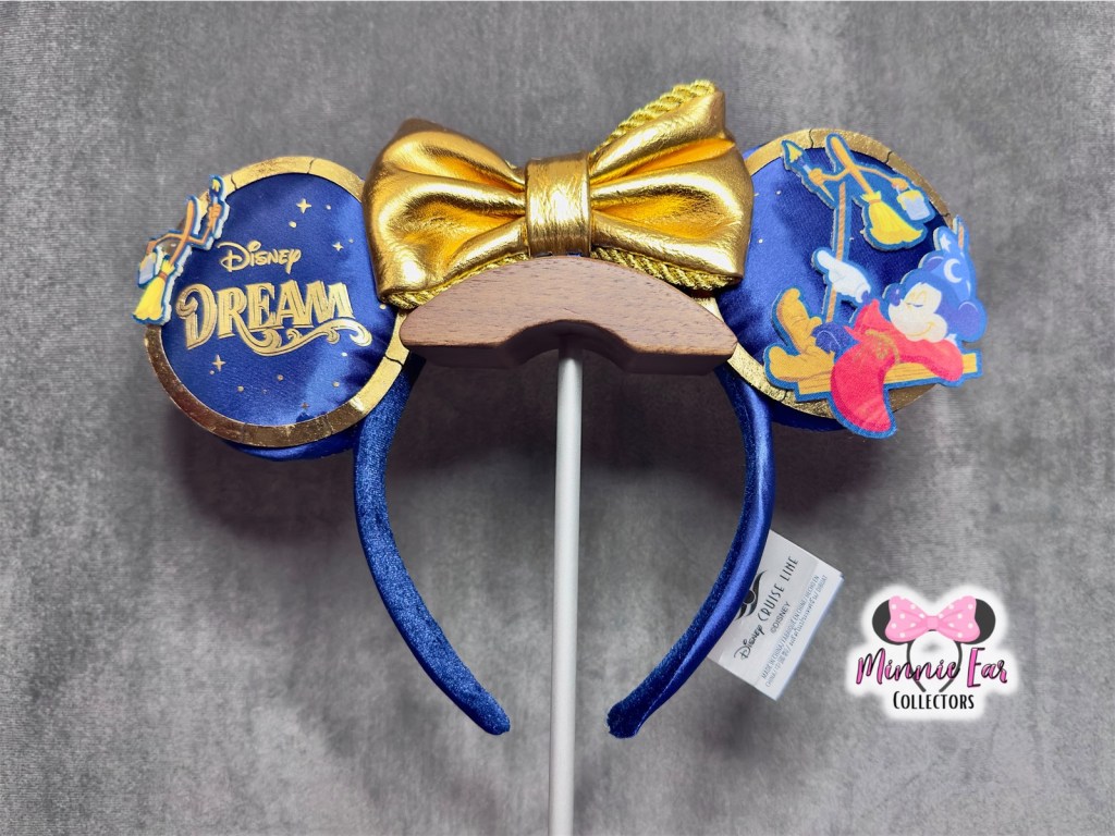The Disney Cruise Line Disney Dream Sorcerer Mickey Ears were released on the Disney Dream starting in early September 2023. The ears are part of the Disney Cruise Line collection with a different pair available on each ship. The ears feature an allover blue satin with the Disney Dream Printed on one side and Sorcerer Mickey on the other with a gold trim along the edge. At the center is a gold nautical bow.