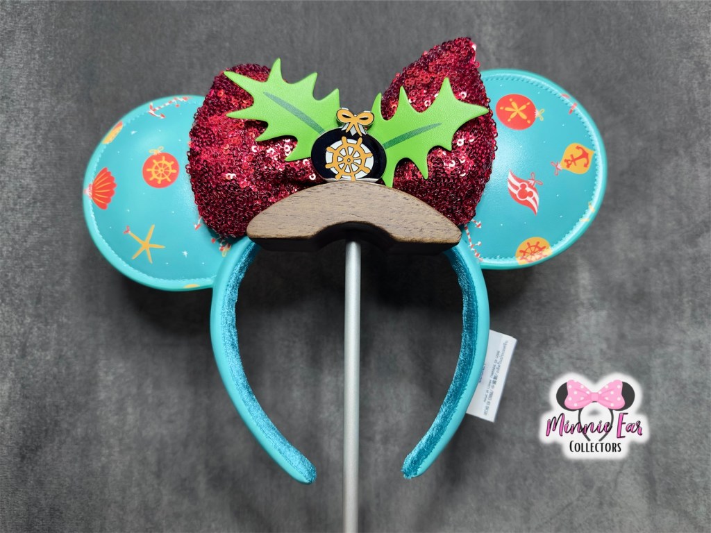 The Disney Cruise Line Disney Very Merrytime Cruise Ears were released on Very Merrytime Christmas cruises in early November 2023. The ears are a light blue simulated leather with a print of nautical ornaments, starfish, and the Disney Cruise Line logo. At the center is a red sequin bow with holly leaves and a nautical ornament emblem. The side of the headband is printed with Disney Cruise Line.