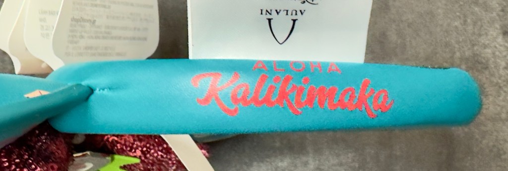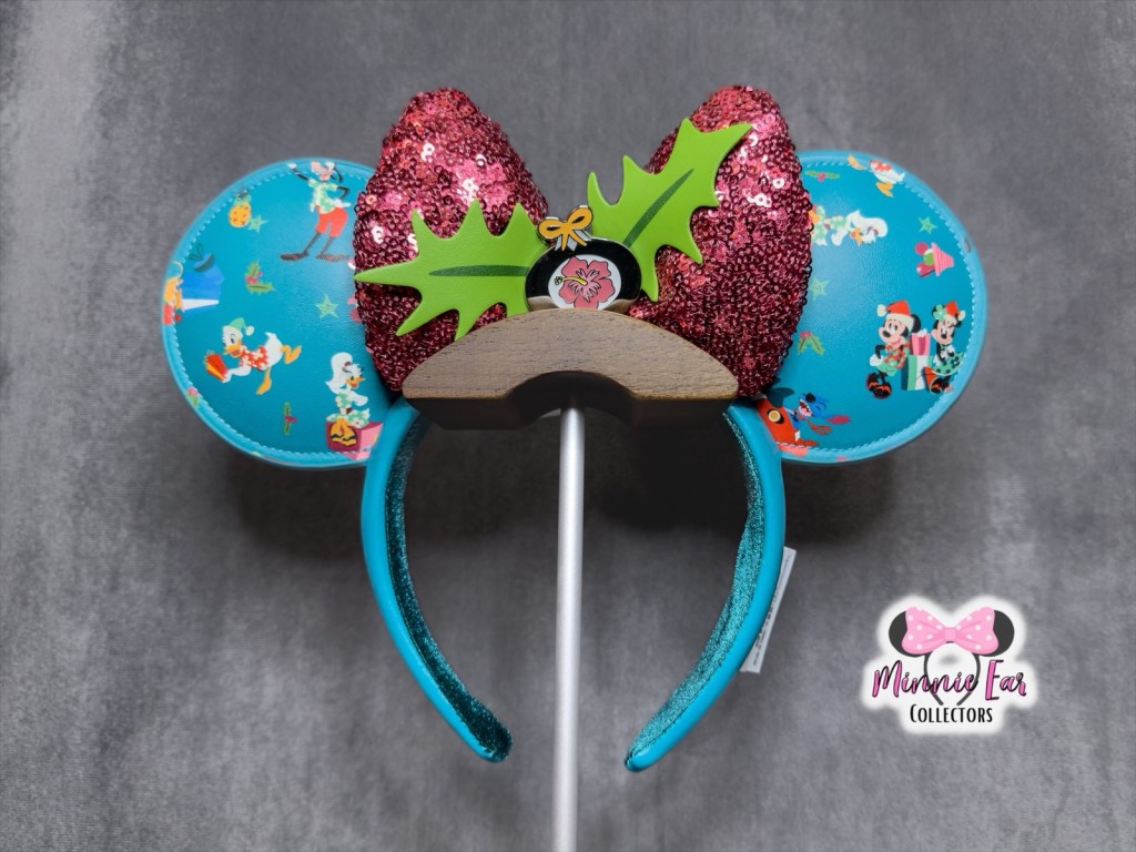 The Aulani Christmas Ears were released at Aulani November 11, 2023. The ears are a light blue simulated leather with a print of Disney characters in their festive-tropical attire. At the center is a red sequin bow with holly leaves and a hibiscus ornament emblem. The side of the headband is printed with Aloha Kalikimaka.