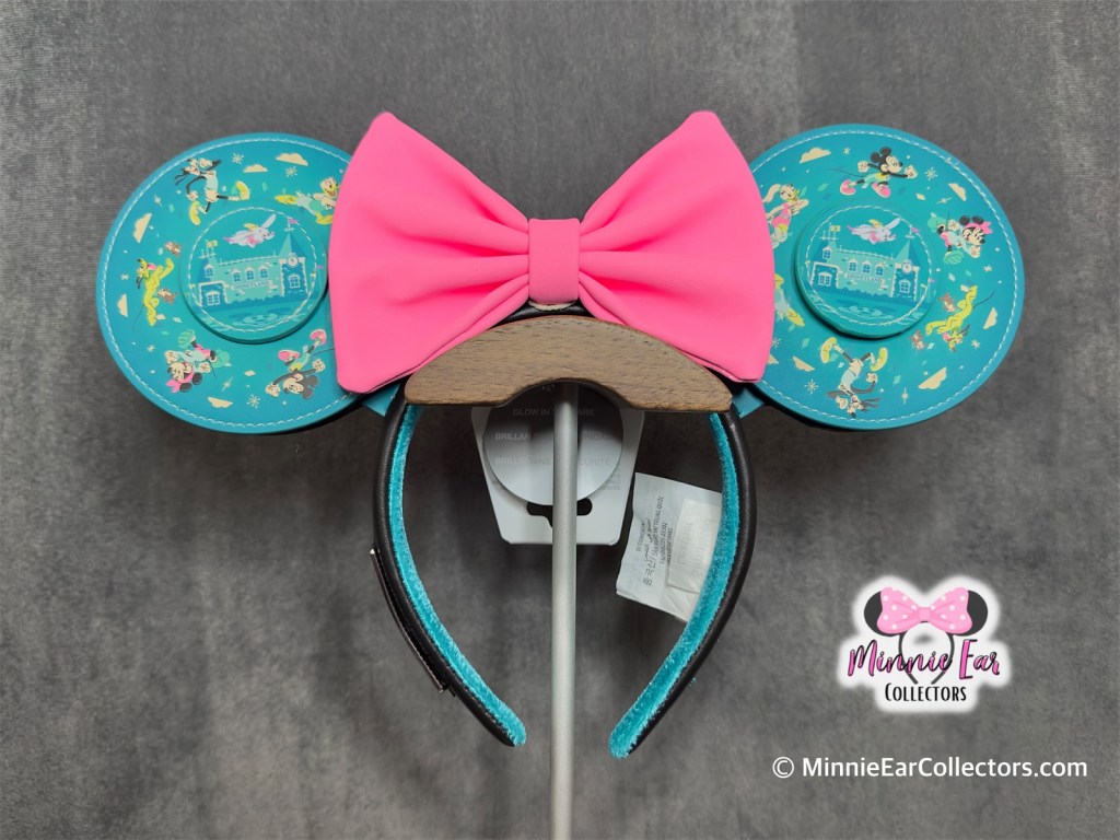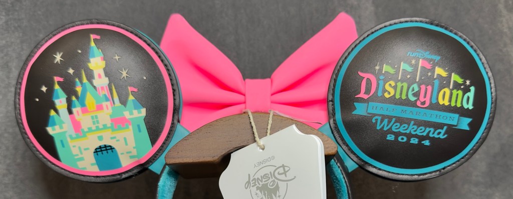 The runDisney Disneyland Half Marathon Ears first released at the runDisney Health & Fitness Expo at the Disneyland Hotel Exhibit Hall on January 11, 2024. The ears are made of a simulated leather and feature the Disneyland train station and Disney characters. Each ear is a spinner in addition to featuring glow in the dark elements on the front and back. A pink bow sits at the center.