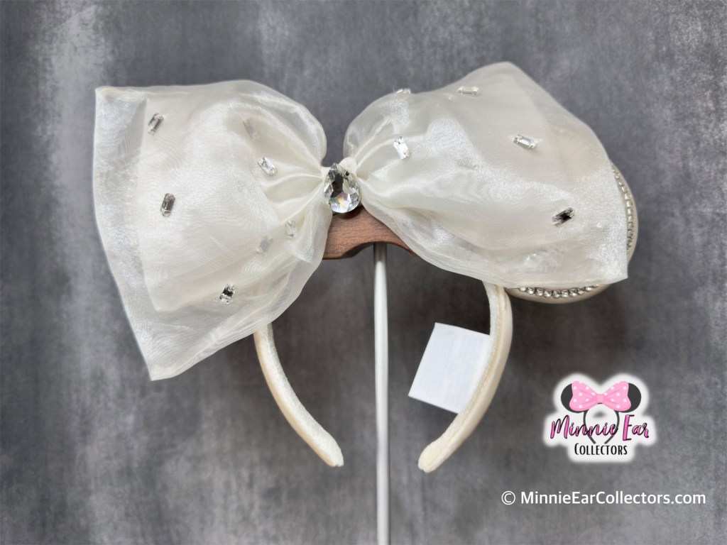 The White Gem Ears with Large White Bow released at Shanghai Disney Resort on January 25, 2024. The ears are a white fabric with gemstone accents and trim around the ears. A large, sheer white bow sits at an angle atop the ears. The bow is also accented with gemstones.