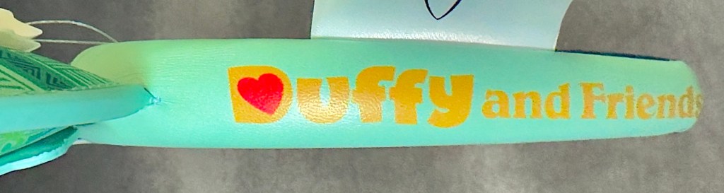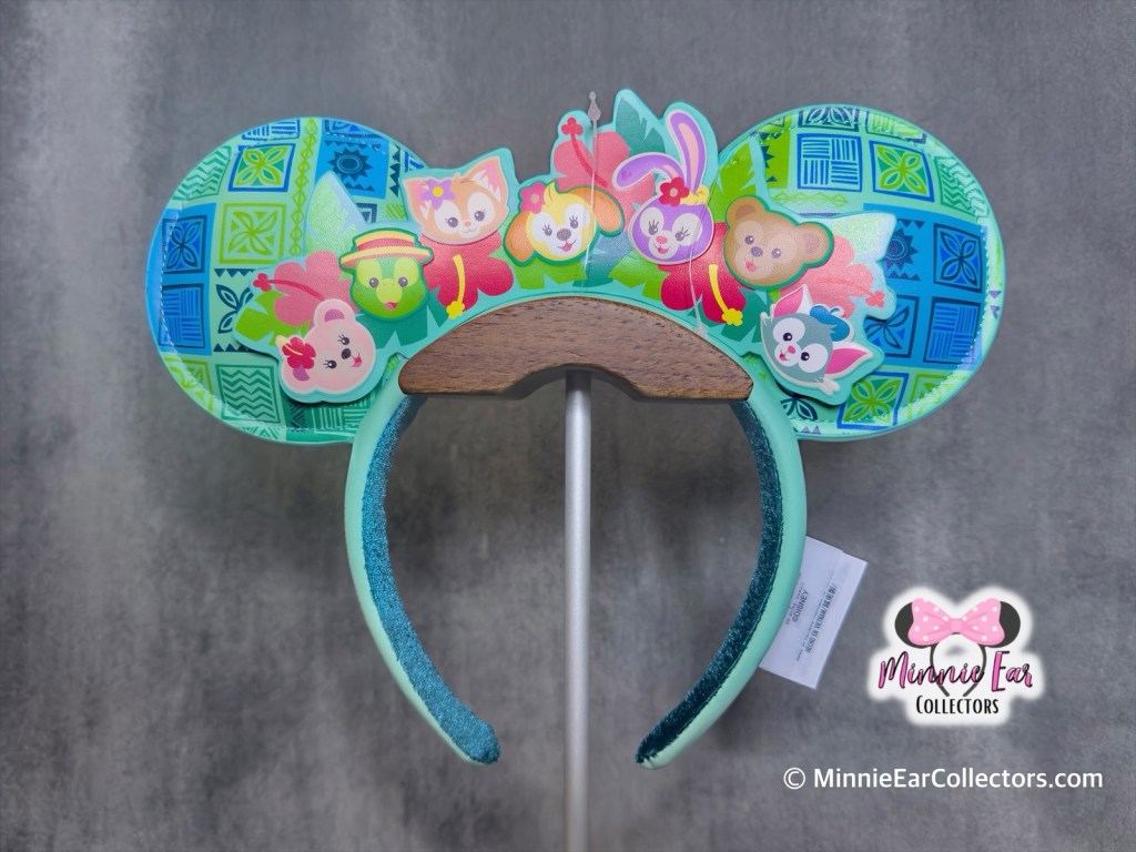 The Duffy and Friends Aulani Ears were released at the Aulani Resort on January 20, 2024. The ears feature an allover blue and green print with Diffy and Friends at the center. The side of the headband is printed with Aulani and Duffy and Friends.