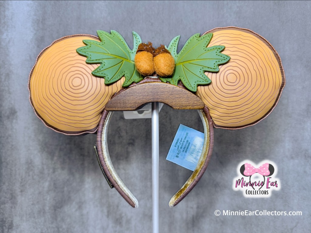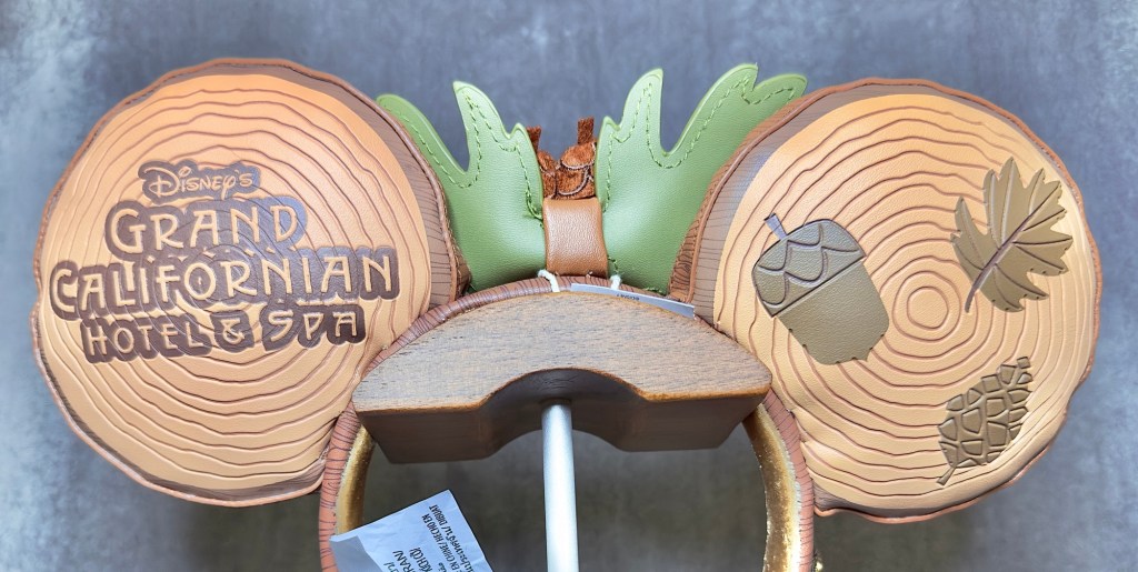 The Grand Californian Ears released at Disney’s Grand Californian Resort on January 30, 2024. The ears feature an all over simulated leather in the style of cut tree sections. The back is embellished with the Disney’s Grand Californian Resort logo on one side and leaves and acorn on the other. The headband is adorned with a metal Loungefly plaque. In lieu of a bow is simulated leather leaves and felt acorns. The ears are nearly identical to the previously released Fort Wilderness Ears (version 2) from the Walt Disney World Resort.
