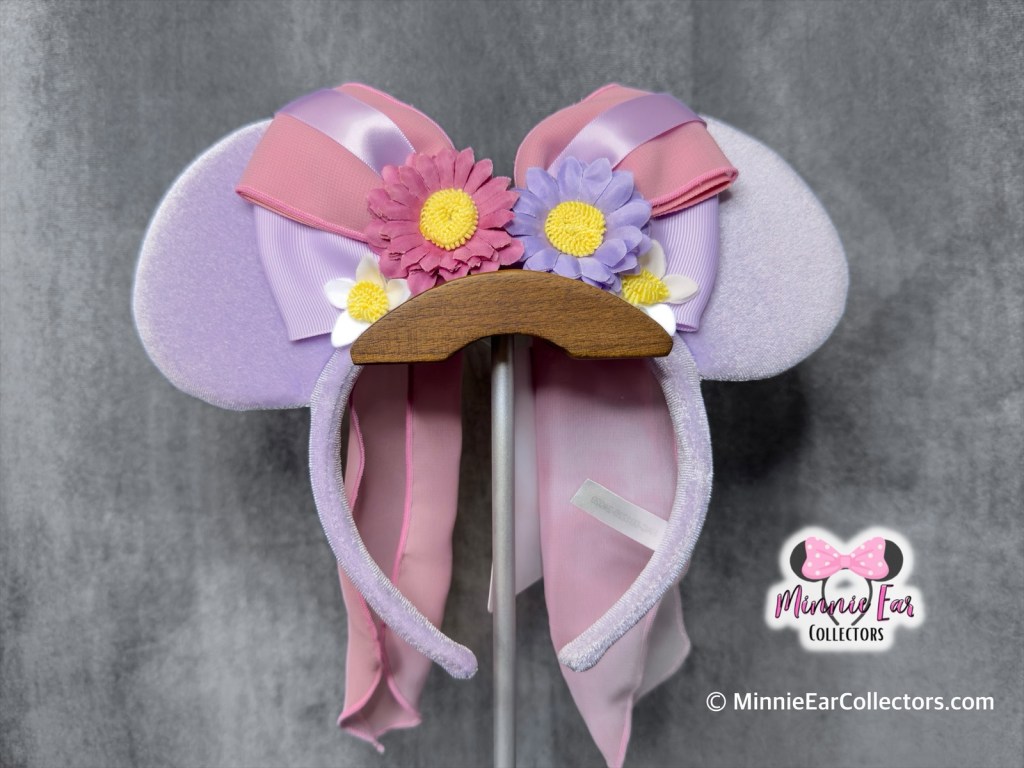 The Rapunzel’s Lantern Festival Ears release at Tokyo DisneySea on May 28, 2024 alongside the opening of Fantasy Springs. The ears are a part of “Rapunzel’s Lantern Festival.” The ears are a light lavender accented with a large pink and purple flowers and a crown of flowers.