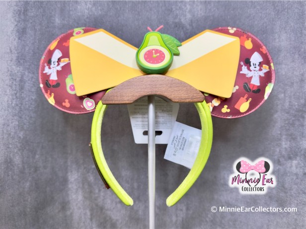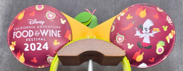 The Disney California Adventure Food & Wine Festival Loungefly Ears were first released in Disney California Adventure on March 1, 2024. The ears feature an allover print on the front and back of the simulated leather ears. One of the ear backs is printed with “Disney California Adventure Food & Wine Festival 2024.” At the center of the ears is a simulated leather “cheese” bow with an “Avocado Time” piece at the center of the bow. The headband is made of a bright green simulated leather with a Loungefly plaque.