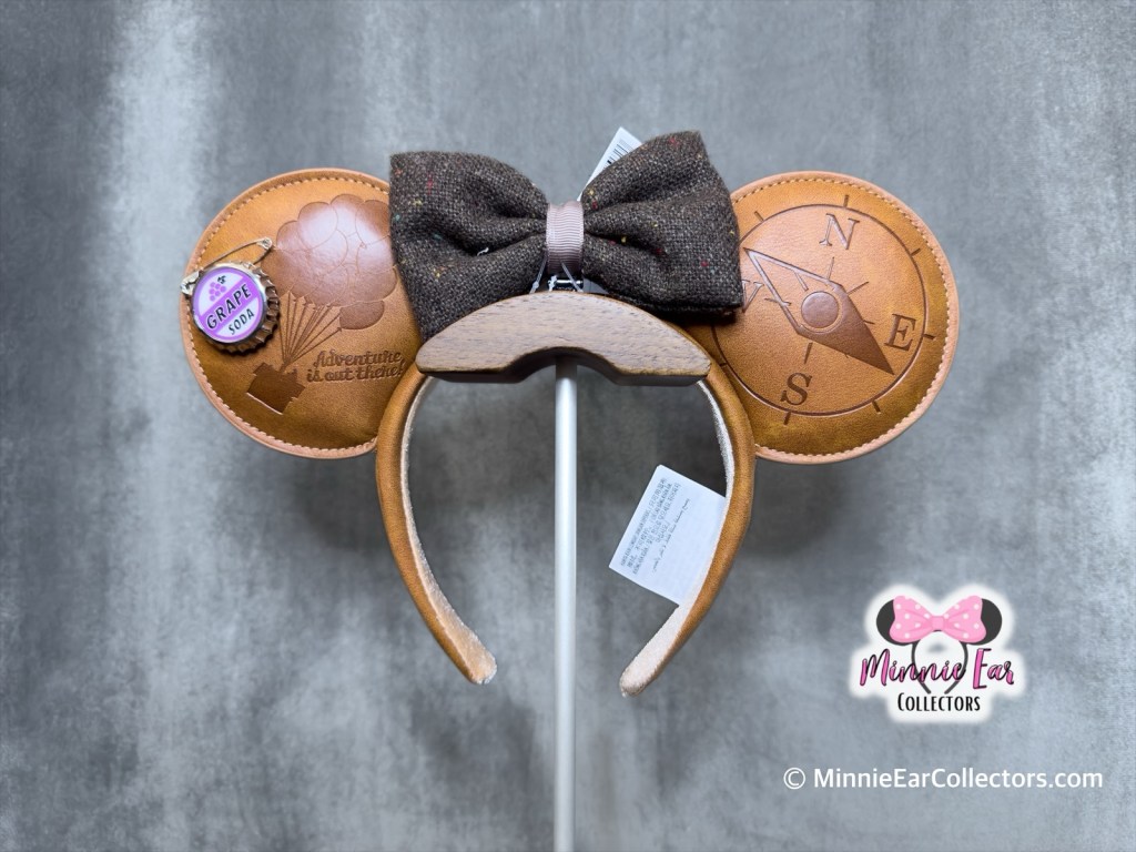 The Up Ears first released at Disneyland on March 25, 2024. They also released on the Disney Store website on April 1, 2024. The ears are a padded simulated leather padded with embossed designs of Carl Fredricksen’s house and balloons with a compass. A brooch of Ellie’s Grape Soda bottlecap is also on one ear and at the center, Carl’s bow tie clips on the headband.
