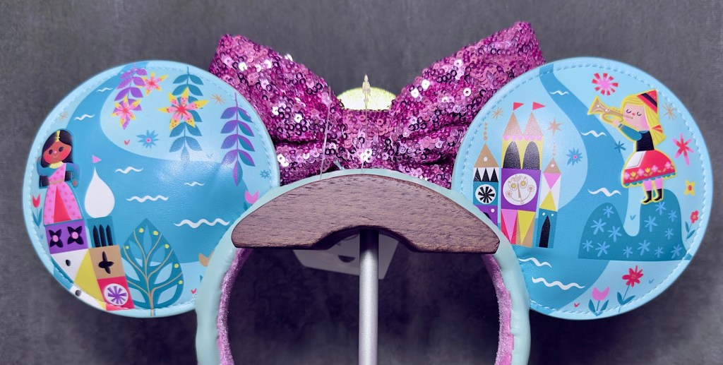 The Disney it’s a small world Ears were first released at World of Disney in Disney Springs on March 28, 2024. The ears were released on the Disney Store website on April 1, 2024 with a price of $29.99. The ears are made of simulated leather and feature embossed small world doll graphics on the front and the back. There is a pink sequin bow with the iconic clock face as a centerpiece. The side of the headband is embroidered with “it’s a small world.”