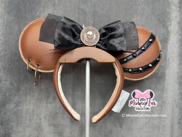 The Brown Leather Pirates of the Caribbean Ears were released at Shanghai Disney Resort on April 4, 2024. The ears feature a pebbled brown simulated leather with a black stripe with studs. There is black chiffon bow with a pirate emblem coin at the center.