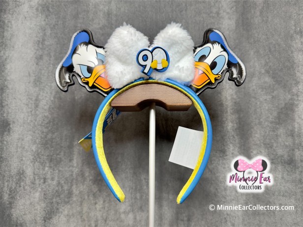 The ears are made of simulated leather printed with a feathery plush bow and a Donald 90th centerpiece.