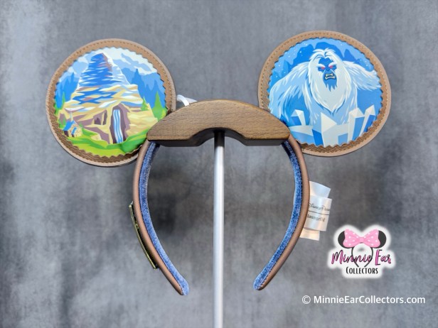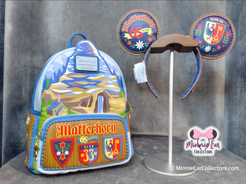 The Club 33 Matterhorn 65th Anniversary Loungefly Ears and merchandise collection was released at Club 33 in Disneyland on March 31, 2024. The ears feature a two sided varied pattern on simulated leather. On the front of the ears, you’ll find the Matterhorn alongside the Yeti known as “Harold.” The back of the ears features a Matterhorn 65th print as well as a Club 33 print – both in a Swiss design. The side of the headband also features the Swiss print and a metal Loungefly plaque. The art on the ears was designed by Jeff Granito. This is the first pair of Club 33 ears to not feature a bow.