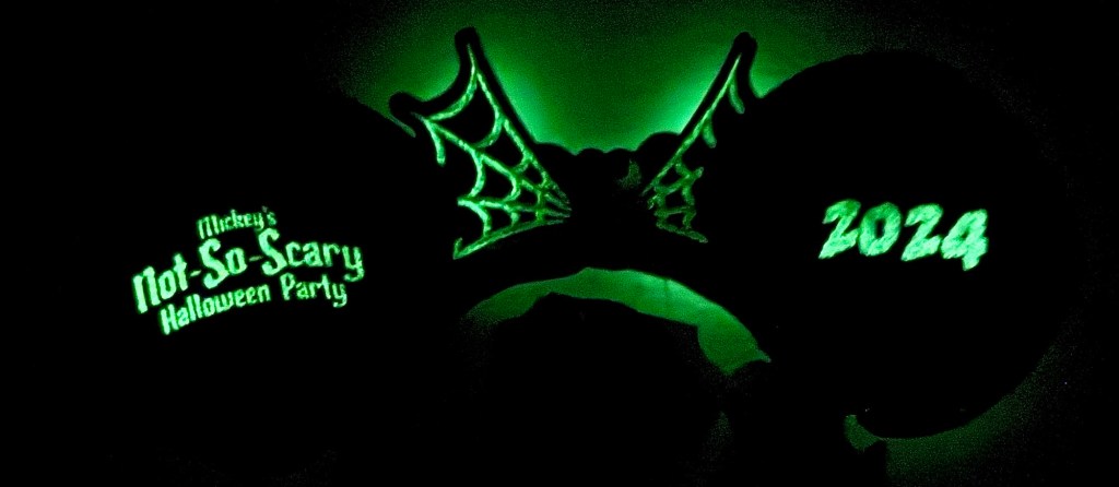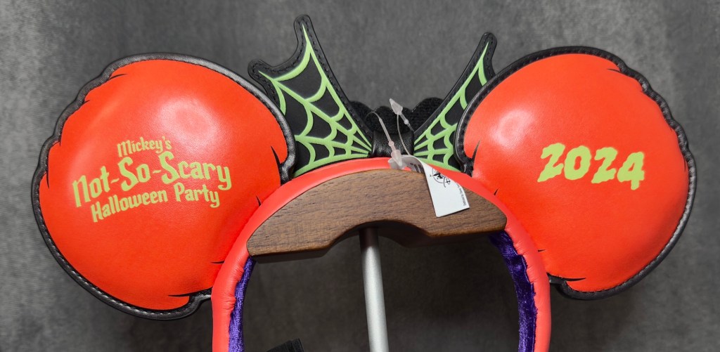 The front of the ears say “Trick or Treat” while the back of the ears feature the party logo and 2024. There is a spiderweb bow at the center of the ears. While not confirmed, the ears appear to be glow in the dark.
