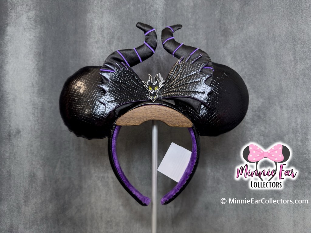 The ears are made of a black padded simulated leather. At the center of the ears is a dragon and Maleficent horns.