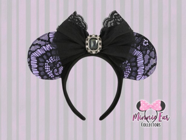 The Purple with Lace Halloween Ears release at Tokyo Disney Resort on September 19, 2024. The ears feature purple fabric covered in black lace. At the center is a black with black lace bow and a large brooch.