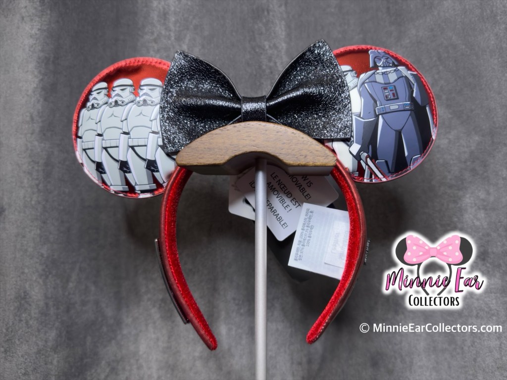 The ears are made of shiny, red simulated leather with Dark Side art designed by artist Alex Riegert-Waters. At the center of the ears is a black removable bow.